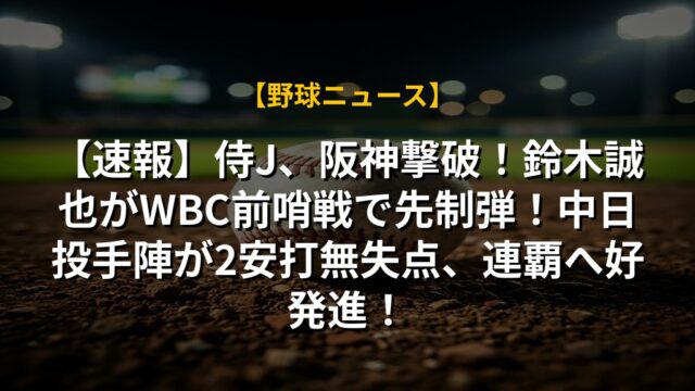 【速報】侍J、阪神撃破!鈴木誠也がWBC前哨戦で先制弾!中日投手陣が2安打無失点、連覇へ好発進!