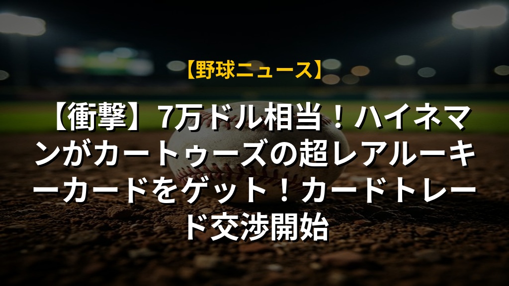話題の野球カード、なんとブルージェイズのハイネマン選手がアスレチックスのカートゥーズ選手の超レアカードを引いたんです!3万ドルから7万ドル相当とも言われ、まさに開運!カートゥーズ選手もカード好きでトレード交渉中とのこと。ハイネマン選手はオークションではなく、カートゥーズ選手に直接譲りたいと考えていて、素敵な展開になりそうですね。選手の将来性やファンコミュニティがカードの価値を左右する時代、今後の野球カード市場にも注目です。