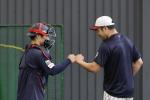 - サカモト・セイシロウ捕手は、キクチ投手のブルペンで球を受け、特徴を把握。コミュニケーションを重ね、連携を深めている。