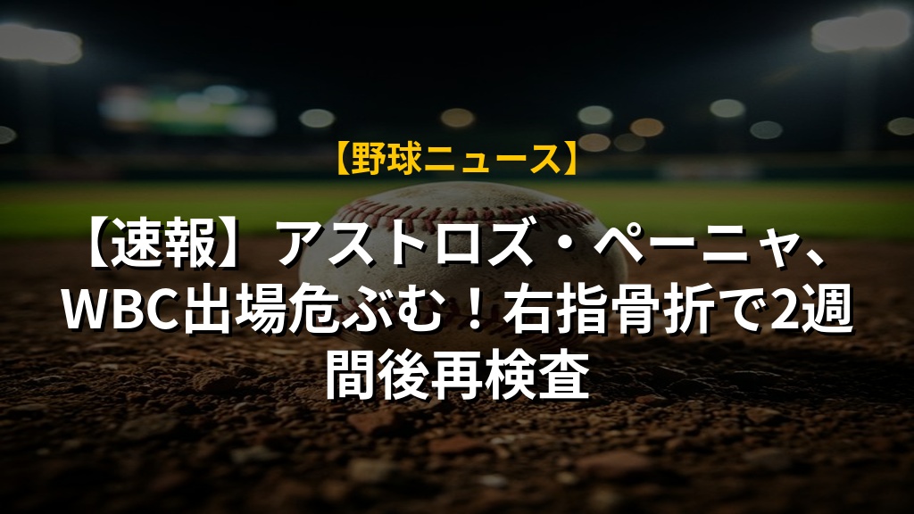 - ヒューストン・アストロズのジェレミー・ペーニャ選手が右指を骨折し、2週間後に再検査を受けることになりました。