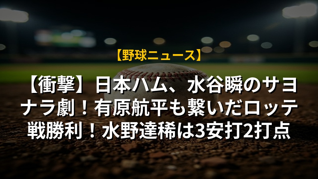 - 北海道日本ハムが、先発・有原航平投手の苦戦を乗り越え、水谷瞬選手のサヨナラ本塁打で千葉ロッテに勝利。