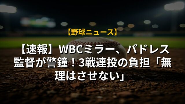 【速報】WBCミラー、パドレス監督が警鐘!3戦連投の負担「無理はさせない」