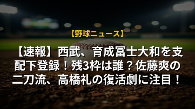 【速報】西武、育成冨士大和を支配下登録!残3枠は誰?佐藤爽の二刀流、高橋礼の復活劇に注目!