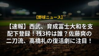 【速報】西武、育成冨士大和を支配下登録!残3枠は誰?佐藤爽の二刀流、高橋礼の復活劇に注目!