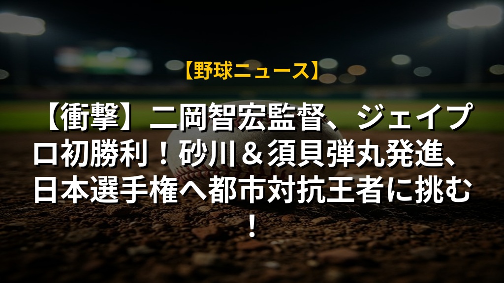 二岡智宏監督率いるジェイプロジェクトが、監督就任後初の公式戦勝利を飾りましたね!打線が全員安打を放ち、砂川選手や新人の須貝選手のホームランが光る圧巻の勝利です。プロ野球で培った二岡監督の手腕が、アマチュアチームでも発揮され始めています。