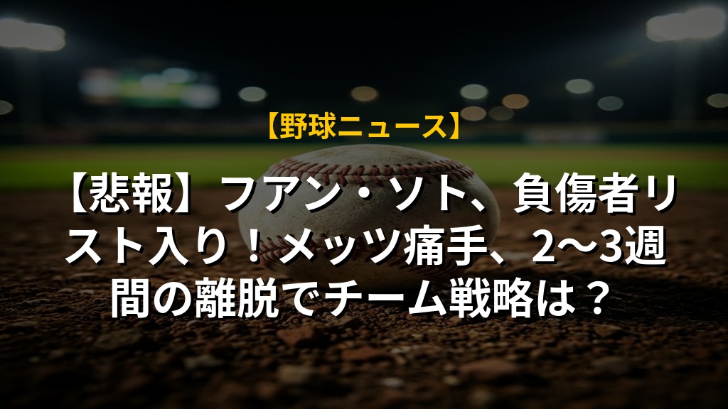 メッツのフアン・ソト選手が右ふくらはぎの張りで負傷者リスト入りとなりました。2~3週間の離脱見込みとのこと、ファンとしては心配なニュースです。好調なスタートを切っていただけに、チームへの影響は大きいでしょう。
