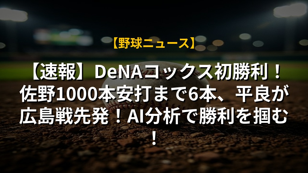 【速報】DeNA平良拳太郎、好投!相川監督がデータ分析で徹底コンディション管理DeNA快勝のニュース概要 DeNAは、投手の好投と打線の爆発により、西武との試合で快勝しました。 先発の平良拳太郎投手が4回を3安打無...