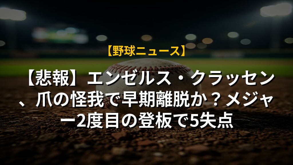 エンゼルスのクラッセン投手が、メジャー2度目の登板中に指の爪を痛めて早退となりました。5失点と苦しみ、チームは逆転負け。昨年マイナーリーグでも同様の怪我を経験しており、投球フォームや指への負担が課題かもしれません。