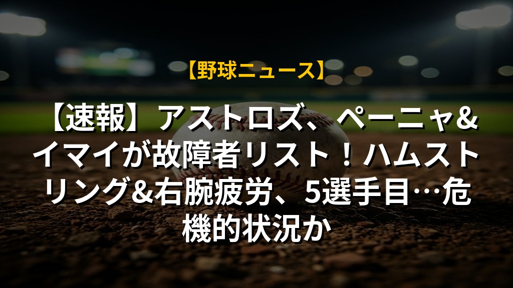 アストロズに痛手です。主力ショートのペーニャ選手や若手イマイ投手が故障者リスト入りとなり、既に複数選手が怪我で離脱している状況にさらに深刻な打撃となりました。特にイマイ投手はメジャー初登板から間もなくの疲労による離脱で、今後の育成にも影響が出そうです。ペーニャ選手も怪我からの復帰を目指していただけに、ファンとしては心配が募りますね。チームは苦戦を強いられていますが、エスパーダ監督は集中力を維持する決意を示しており、今後の巻き返しに期待したいです。