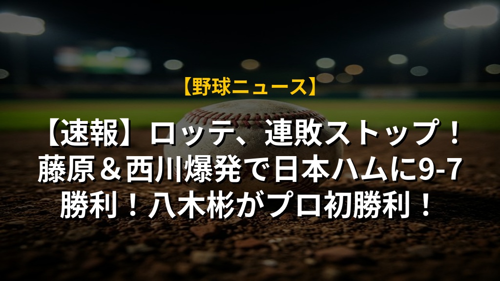 ロッテが日本ハムとの接戦を9-7で制し、3連敗をストップしました。初回先制から打線が爆発し、藤原選手と西川選手がそれぞれマルチ安打を記録。特に西川選手の活躍が光りました。また、プロ5年目の八木投手が嬉しいプロ初勝利を挙げ、チームに勢いをもたらしました。