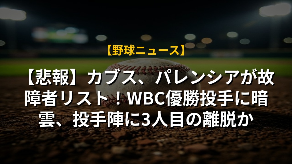 カブスのパレンシア投手が左腹斜筋の張りで15日間の故障者リスト入りとなり、チームの守護神を失いました。WBCでの活躍から期待されていただけに、ファンとしては痛手です。さらに、ホートン投手のトミー・ジョン手術による長期離脱も発表され、投手陣は厳しい状況が続いています。