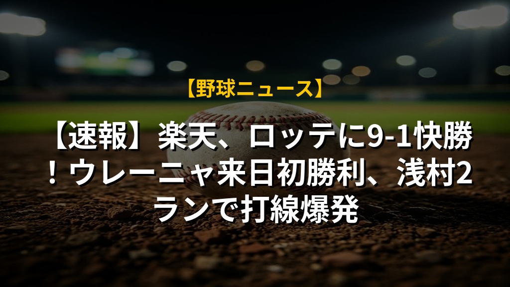 楽天がロッテに9-1の大勝!ウレーニャ投手が来日初勝利を飾り、チームに明るい風を吹き込みました。打線も村林選手、浅村選手を中心に爆発し、浅村選手は今季1号となる2ランを放ちました。終盤は渡辺投手がピンチを乗り越え、勝利を締めくくりました。この勢いが続けば、楽天はパ・リーグで存在感を増していくのではないでしょうか。今後の活躍が楽しみです!
