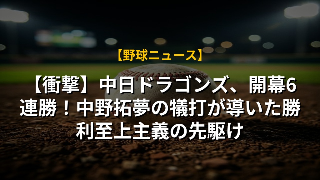 中日ドラゴンズの開幕6連勝は、単なる好調の継続ではない。チームとしての戦術理解度と、選手の意識変革がもたらした結果として捉えるべきである。特に中野拓夢選手の犠打は、現代野球における「勝利至上主義」を体現した象徴的なプレーと言えるだろう。