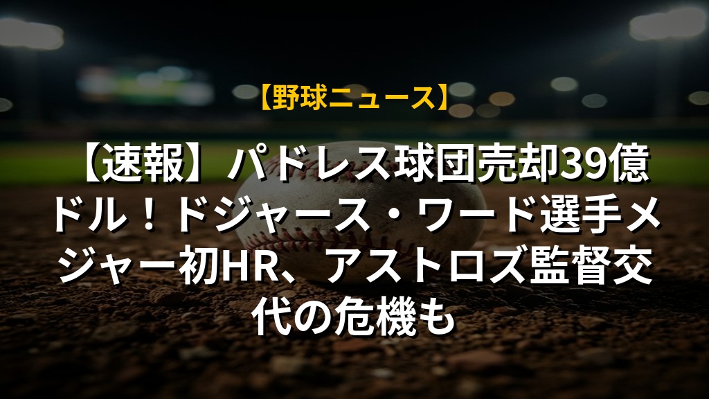 【速報】パドレス球団売却39億ドル!ドジャース・ワード選手メジャー初HR、アストロズ監督交代の危機も