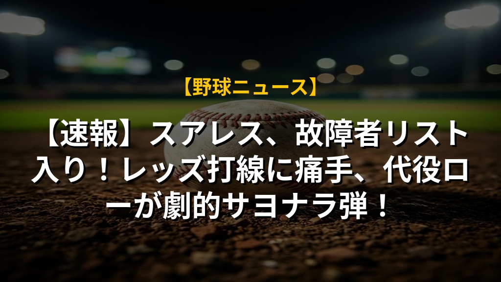 スアレス選手の故障は、レッズファンにとって心配なニュースですね。打線強化のキーマンの一人が離脱することになり、チームの勢いに影響が出るかもしれません。しかし、代役のロー選手がサヨナラホームランを放つなど、チームには新たな力も生まれています。
