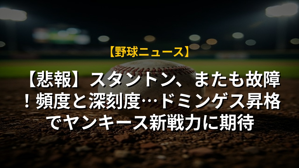 【速報】スタントン怪我!ヤンキース連勝止まる?チビリー故障、ウィザース復帰も不安が…ヤンキース怪我のニュース概要 ニューヨーク・ヤンキースのジャンカルロ・スタントン選手は、右ふくらはぎの張りにより、ヒューストン・アストロ...