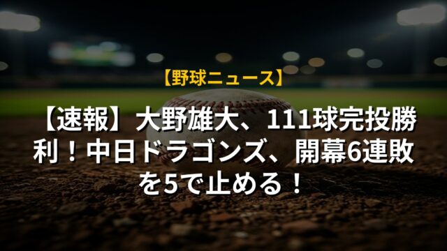 【速報】大野雄大、111球完投勝利!中日ドラゴンズ、開幕6連敗を5で止める!