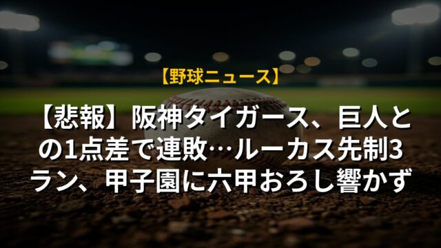 【悲報】阪神タイガース、巨人との1点差で連敗…ルーカス先制3ラン、甲子園に六甲おろし響かず