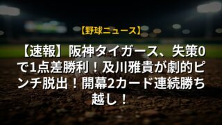 【速報】阪神タイガース、失策0で1点差勝利!及川雅貴が劇的ピンチ脱出!開幕2カード連続勝ち越し!
