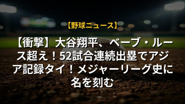 【衝撃】大谷翔平、ベーブ・ルース超え!52試合連続出塁でアジア記録タイ!メジャーリーグ史に名を刻む